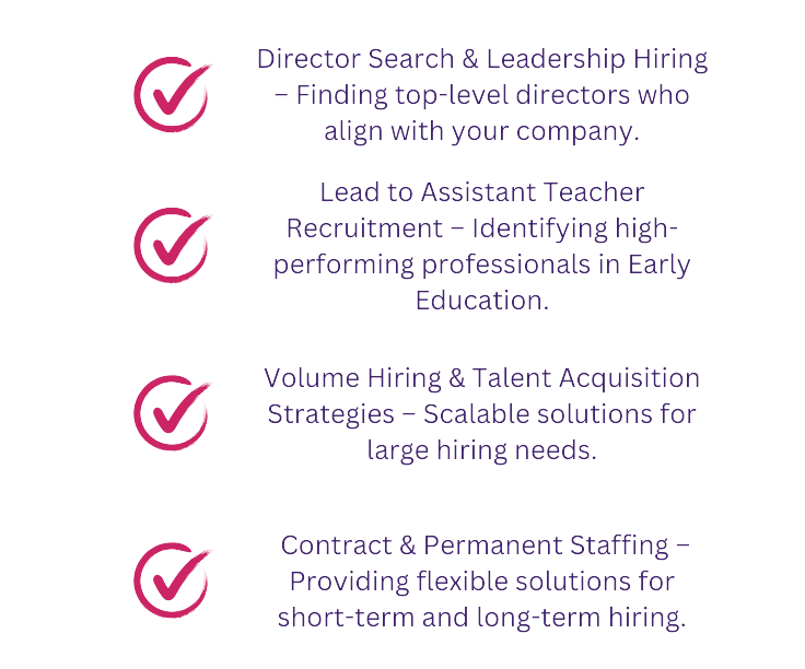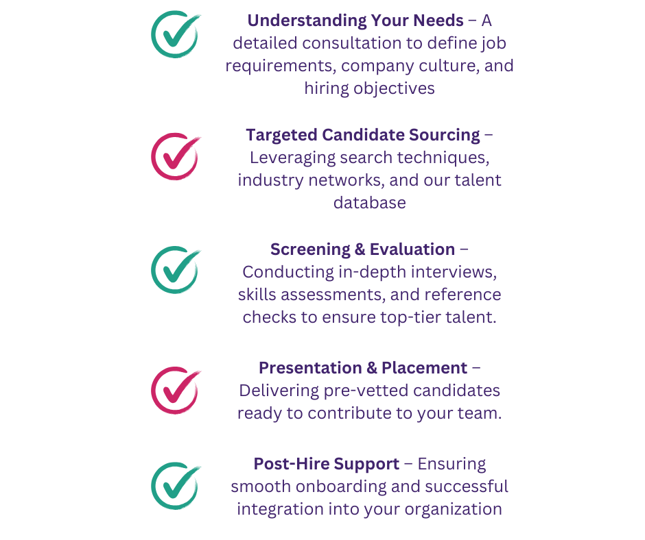We tailor our staffing and recruitment solutions to your unique needs. Generally, this includes in-depth conversations with you about your business and the role, interviews with vetted candidates, feedback, compensation, closing an offer with your chosen candidate, pre-employment screening, and gathering documents as needed. We will set expectations with you, but ultimately, – we’re building relationships.